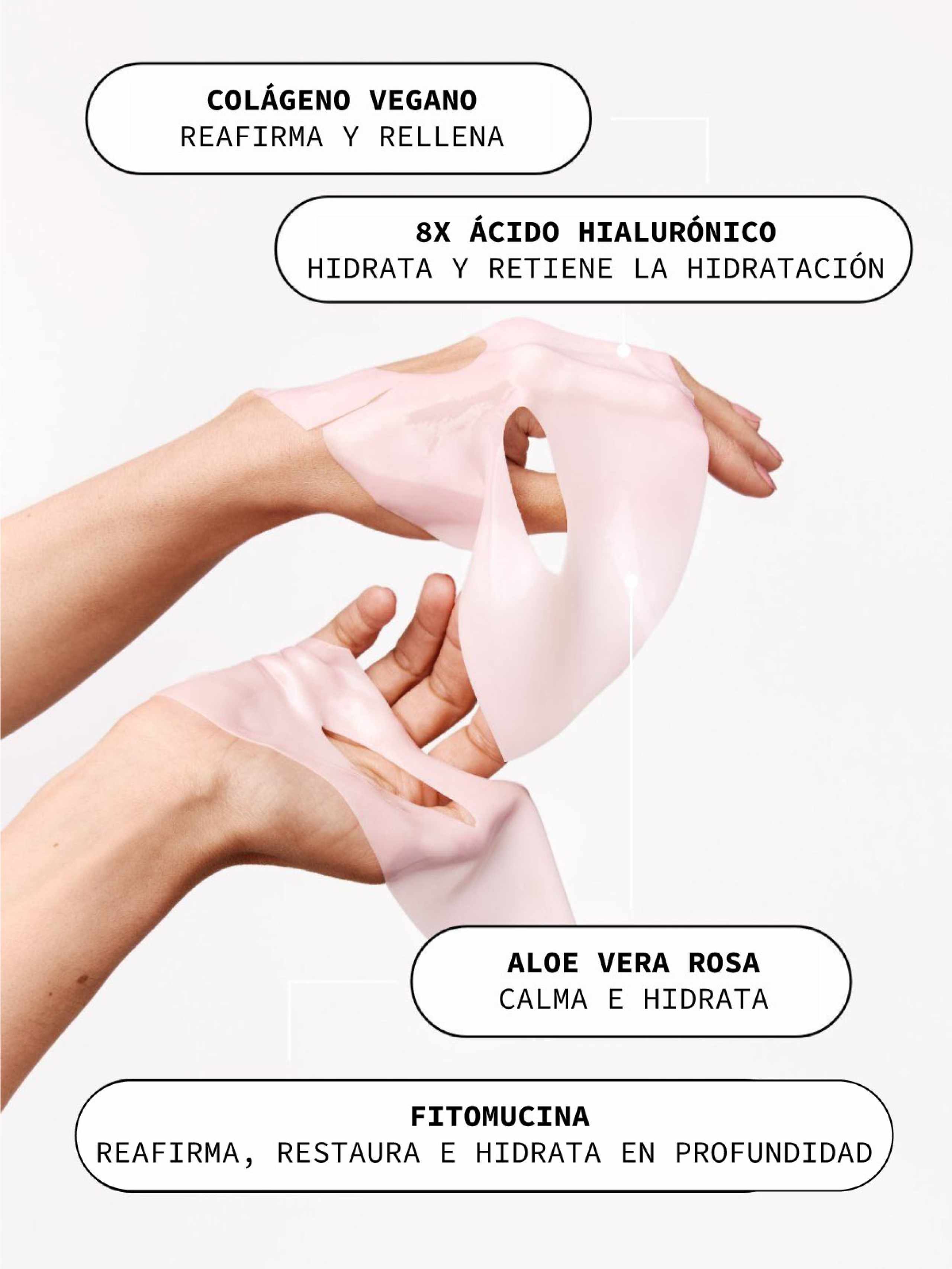 Una mascarilla que aporta hidratación, elasticidad y luminosidad, todo en un instante. ¿El resultado? Una piel que luce como si hubieras bebido 3 litros de agua, disfrutado de 8 horas de sueño reparador te hubieras dado un detox digital completo.