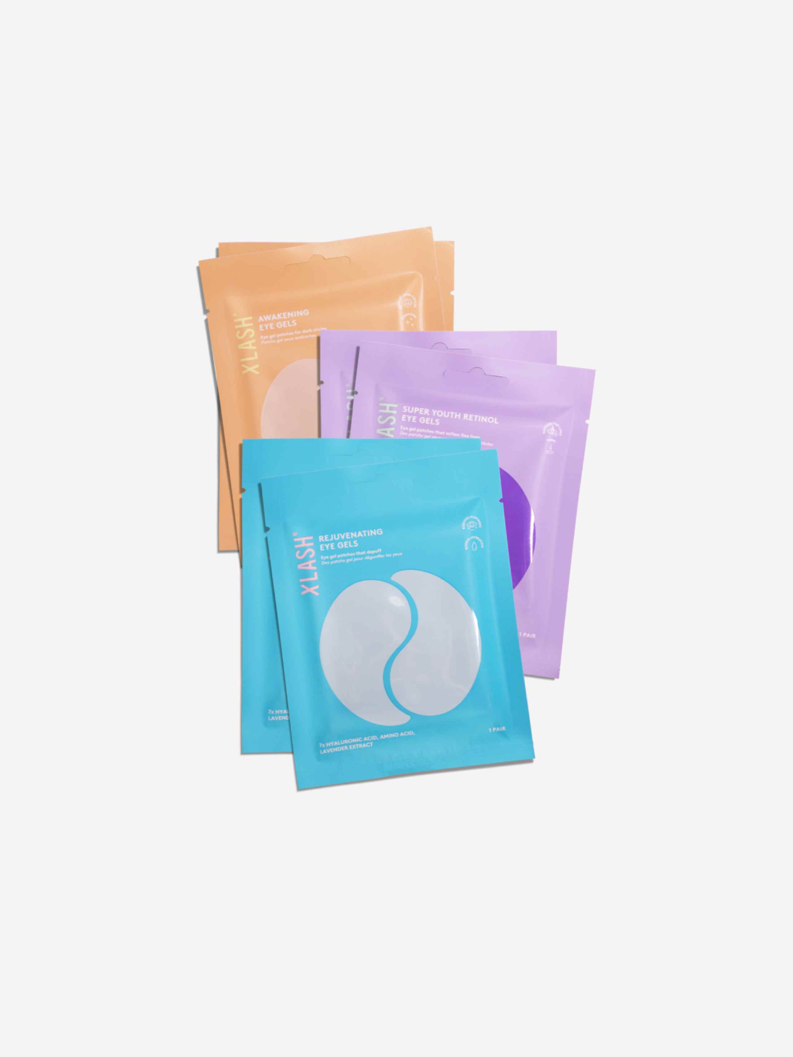 Rejuvenating Eye Gels 1 pair: Aqua, Glycerin, Methylpropanediol, Chondrus Crispus Extract, Hyaluronic Acid, Hydrolyzed Hyaluronic Acid, Potassium Hyaluronate, Hydroxypropyltrimonium Hyaluronate, Hydrolyzed Sodium Hyaluronate, Glyceryl Glucoside, Allantoin, 1,2-Hexanediol, Lavandula Angustifolia (Lavender) Extract, Arginine, Ceratonia Siliqua (Carob) Gum, Hydroxyacetophenone, Cellulose Gum, Xanthan Gum, Potassium Chloride, PEG-60 Hydrogenated Castor Oil, Glyceryl Caprylate, Calcium Lactate, Sucrose, Synthetic Fluorphlogopite, Butylene Glycol, Sodium Hyaluronate, Alumina, Phenoxyethanol, Pentylene Glycol, Sodium Hyaluronate Crosspolymer, Sodium Acetylated Hyaluronate, Ethylhexylglycerin, CI 77891, CI 42090.