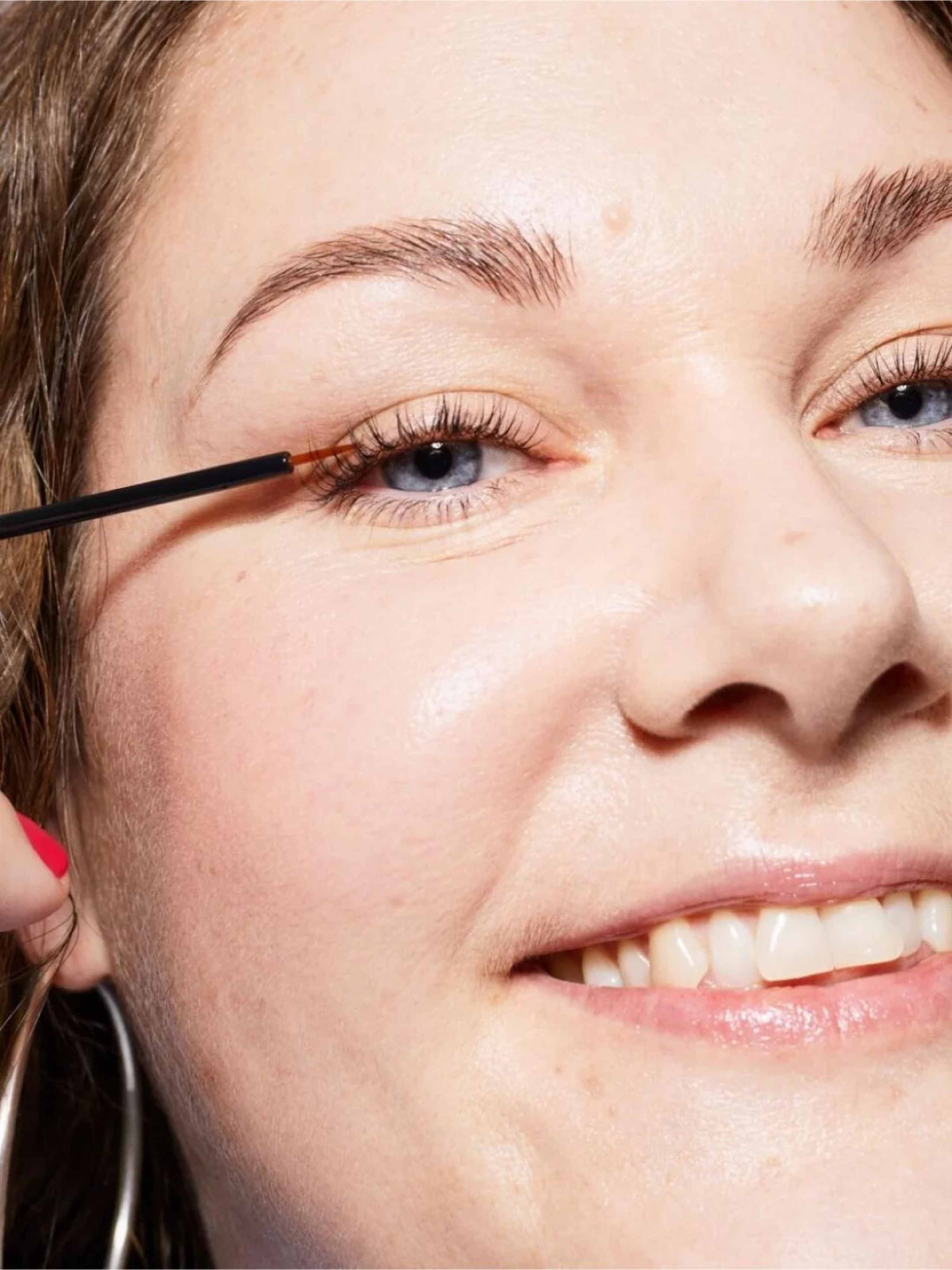- Aplica una fina línea sobre la piel limpia y seca en la raíz de las pestañas superiores (similar a un eyeliner) dando varias pasadas a ras de pestañas.